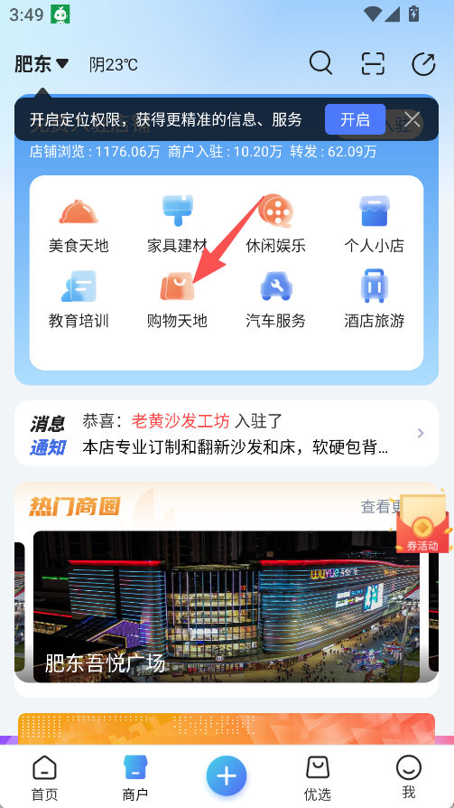 2、进入商户板块后,能按美食、建材、购物天地等分类查找商户。