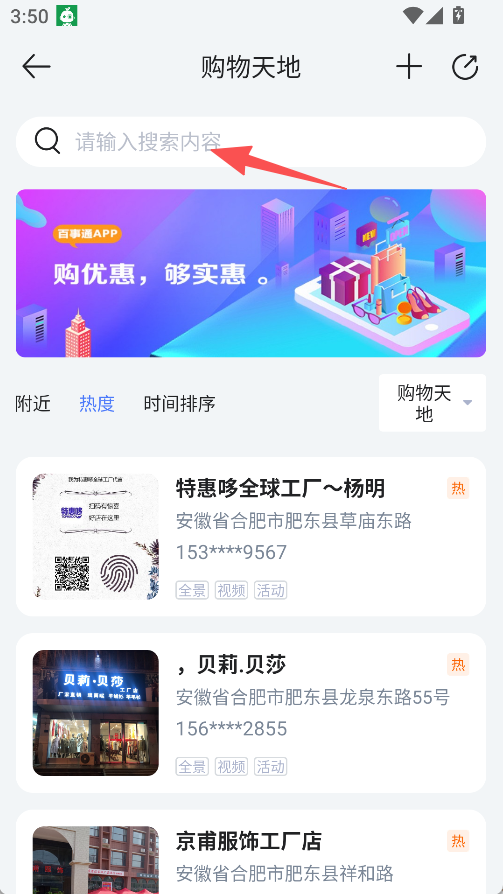 《百事通》涵盖丰富生活服务功能,有招聘、求职、房屋租售等信息,还有本地推广、二手交易等服务。进入商户,能看到美食、建材等各类商户分类,像“购物天地”里可搜索商户,查看其地址、联系方式等,方便用户获取本地生活服务与商户信息,满足多样生活需求。
