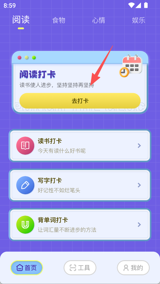 2、阅读分类下具备专项打卡功能,可进行读书记录、写字练习、背单词打卡,满足阅读相关学习需求。