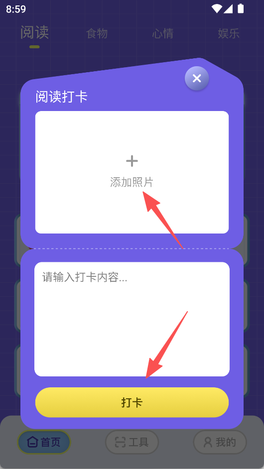 1、进入阅读分类点击“去打卡”,可添加照片、输入内容。