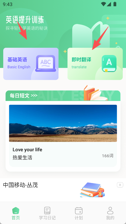 1、聚焦英语提升训练,设置基础英语板块,还有即时翻译功能,助力英语学习与翻译需求。