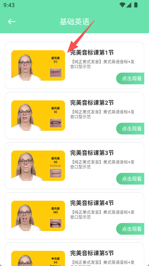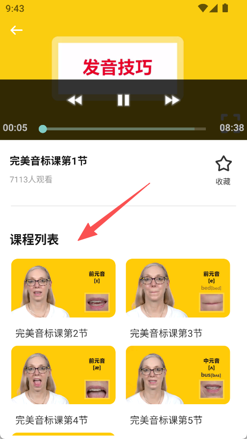 2、点击课程,可观看纯正美式发音教学,包含音标和发音口型示范。