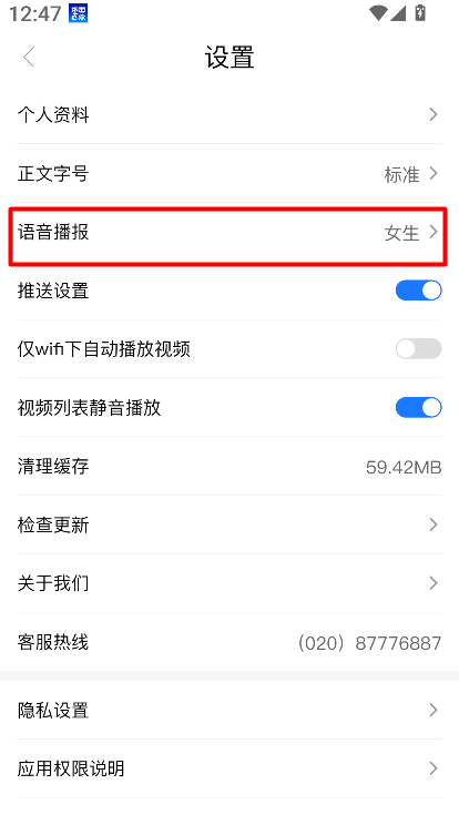 3、在设置页面中选择语音播报功能,切换为女生声音后保存设置,后续新闻内容即可通过女生语音进行播报。