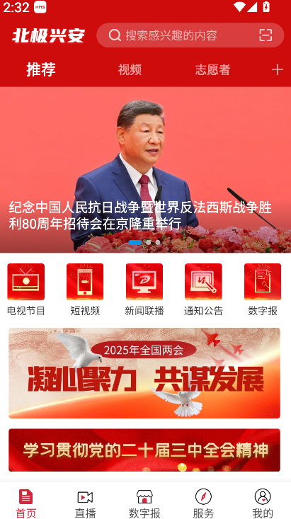 1、进入《北极兴安》首页后,可以直接浏览电视节目、短视频、新闻联播等多类内容,满足日常资讯与娱乐的不同需求。