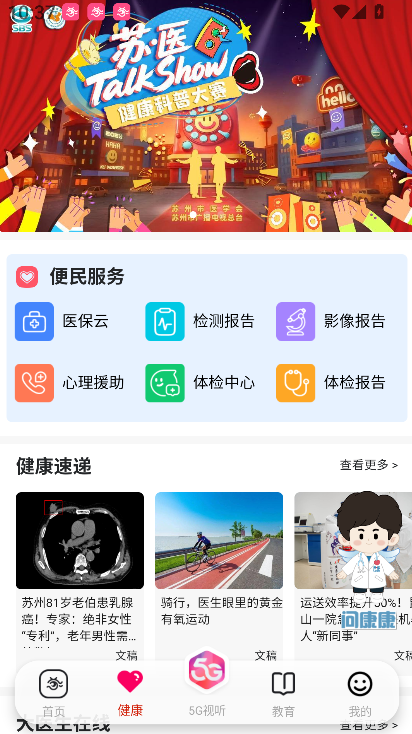 2、健康板块提供便民服务、医保云、检测报告、心理援助等功能,帮助关注身体状况,查询相关服务,获取医疗与心理支持。