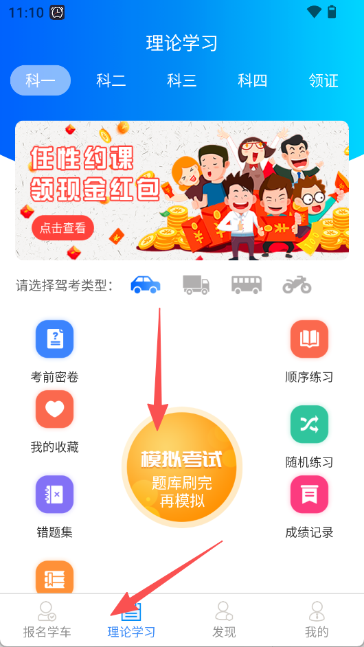 1、进入“理论学习”页面,选择驾考类型,可使用考前密卷、顺序练习等功能学习。