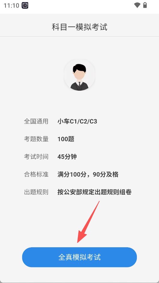 2、点击“模拟考试”,能参与全真模拟,了解考题数量、考试时间等规则。