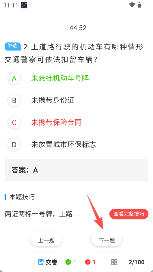 3、做题时可查看答案及技巧,能通过“上一题”“下一题”切换题目,也可交卷。
