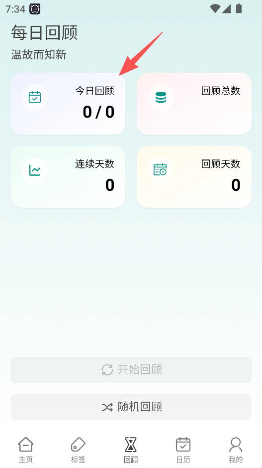 2、能查看今日回顾、回顾总数、连续天数、回顾天数,支持开始回顾和随机回顾。