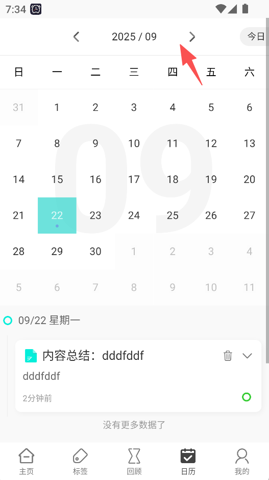 3、具备日历视图,点击箭头切换月份,查看不同日期对应的内容总结,便于记录的追溯与查看。