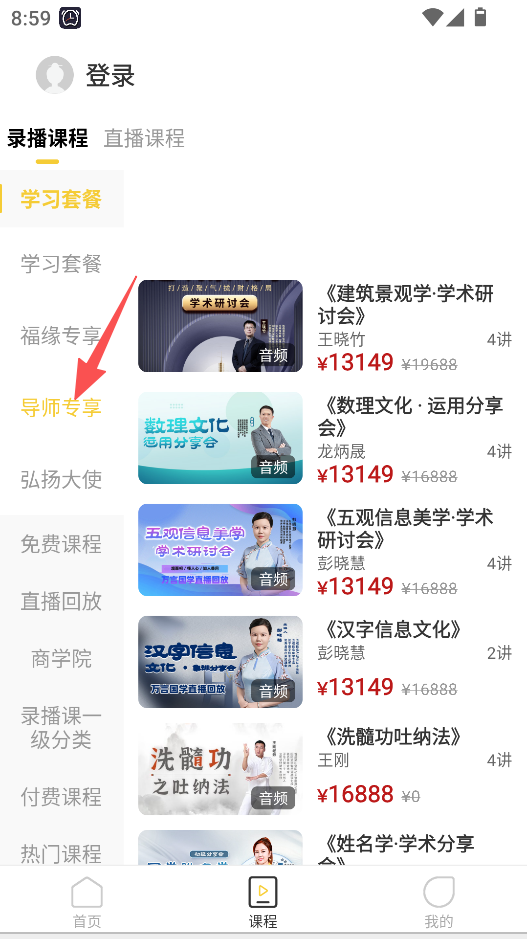 2、支持课程分类浏览,进入课程页面后,能选择“导师专享”等板块,查看对应板块的课程资源。