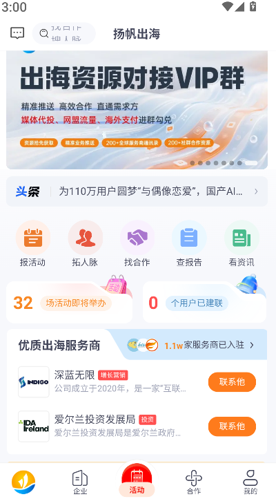 1、进入《扬帆出海》首页后,可以进行人脉扩展、寻找合作伙伴以及浏览行业资讯,全面获取国际市场动态。