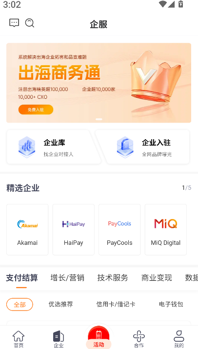 2、在企业服务板块中,设有企业出海商务通、企业库与企业入驻功能,帮助展示信息并对接潜在合作资源。