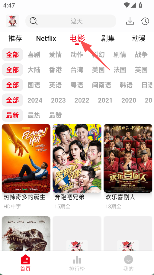 1、支持影片分类筛选,可按推荐、Netflix、电影等大分类,以及电影的类型、地区、语言、年份等细类进行筛选。