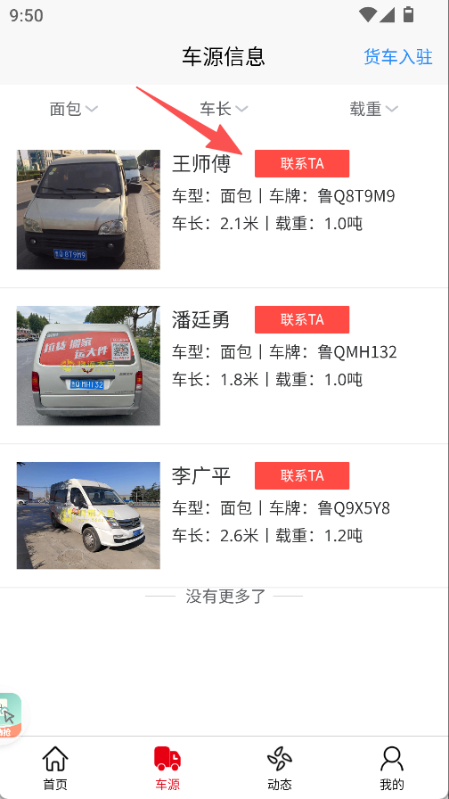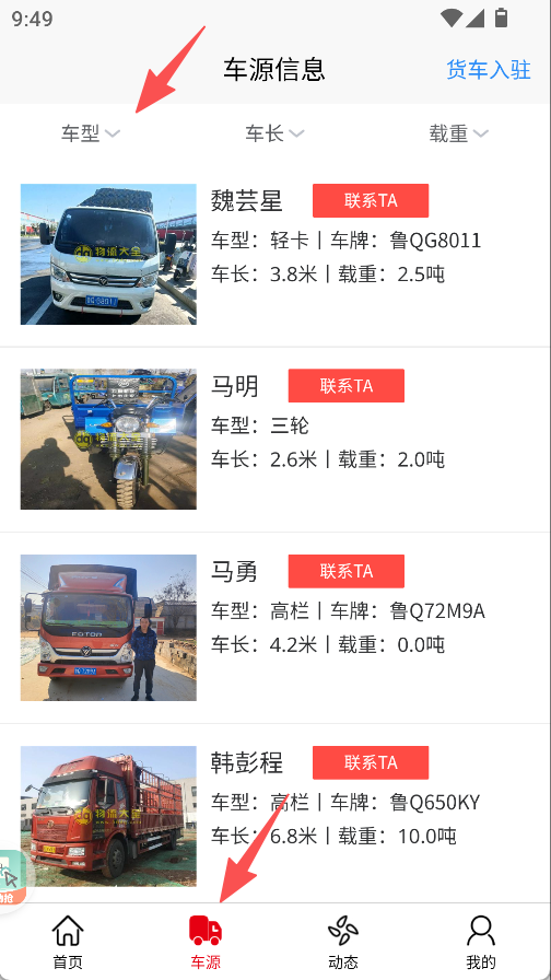 1、拥有车源信息展示功能,在“车源”板块呈现货运车辆的图片、车主姓名及车辆规格等内容。
