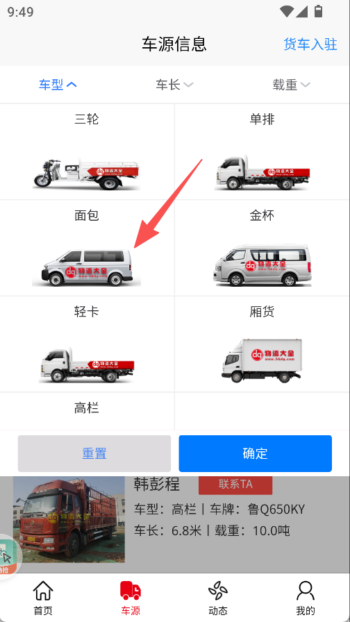 2、可通过车型、车长、载重等多个维度进行筛选,能精准找到符合运输要求的货运车辆。