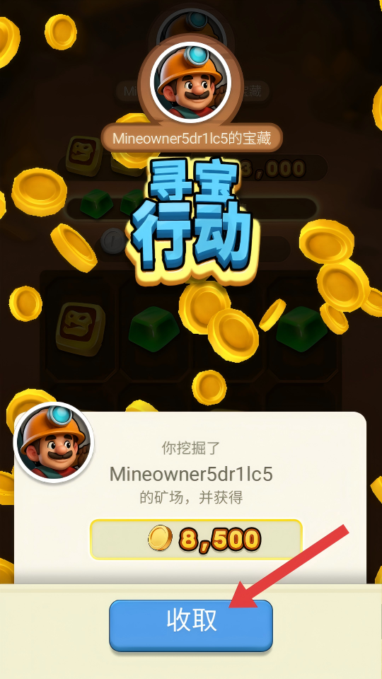 3、成功挖掘宝藏后,出现【寻宝行动】界面,点击【收取】按钮获取挖到的金币奖励。