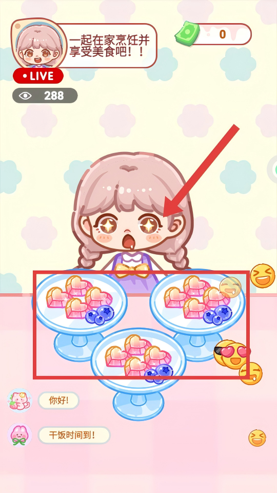 2、直播过程中,留意红框内的【观众请求】,根据需求点击【准备食物】按钮制作对应甜品。