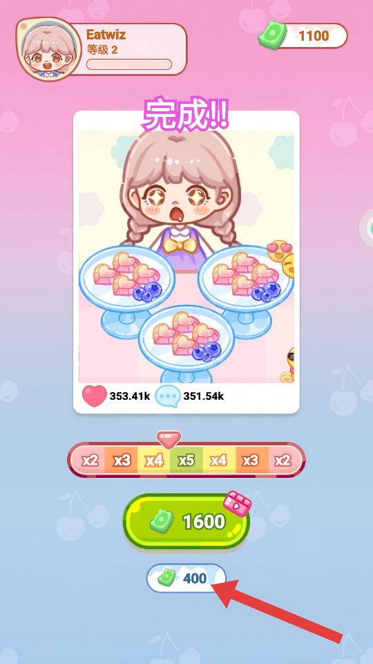 4、直播完成后,出现【完成!!】界面,点击领取【400】等奖励,用于解锁新甜品或升级直播设施。