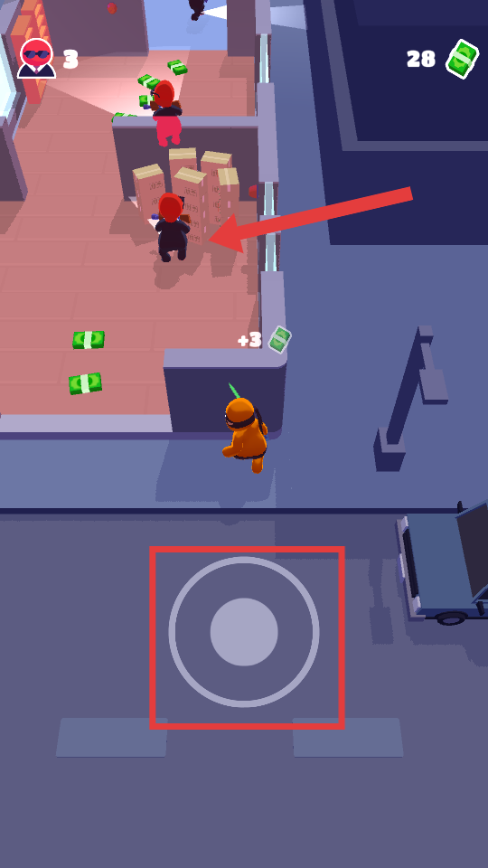 2、进入游戏后,当敌人背对着你时,通过红框内的【虚拟摇杆】控制角色移动至其身后进行击杀。