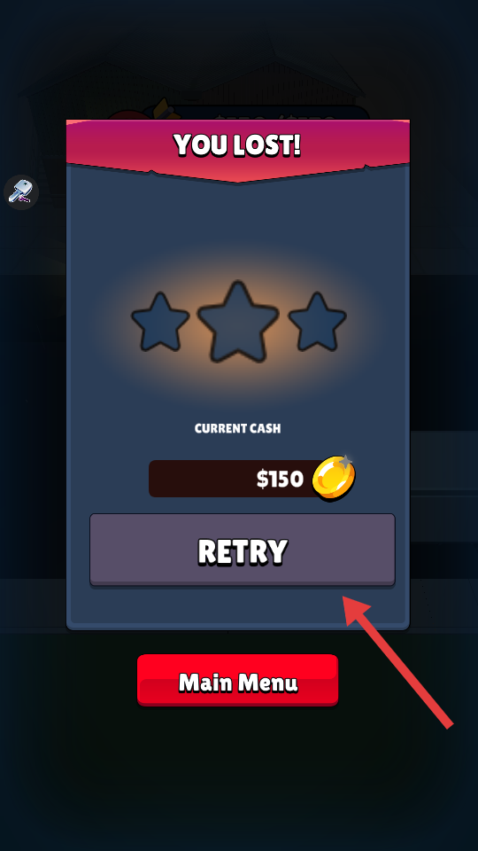4、若出现“YOULOST!”提示,说明挑战失败,可点击【RETRY】按钮重新尝试该关卡。