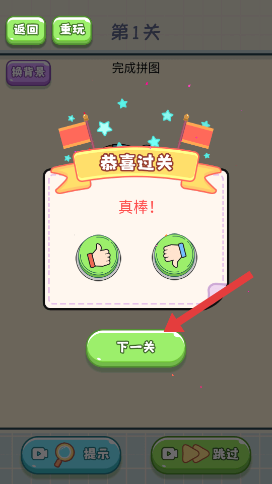 4、出现【恭喜过关】界面后,点击【下一关】按钮,解锁并挑战后续的拼图关卡。
