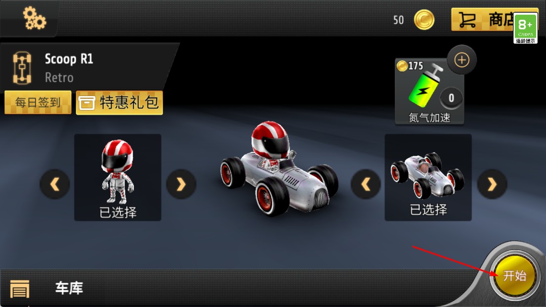 1、在车库选好赛车与车手,点击【开始】,进入赛车比赛。