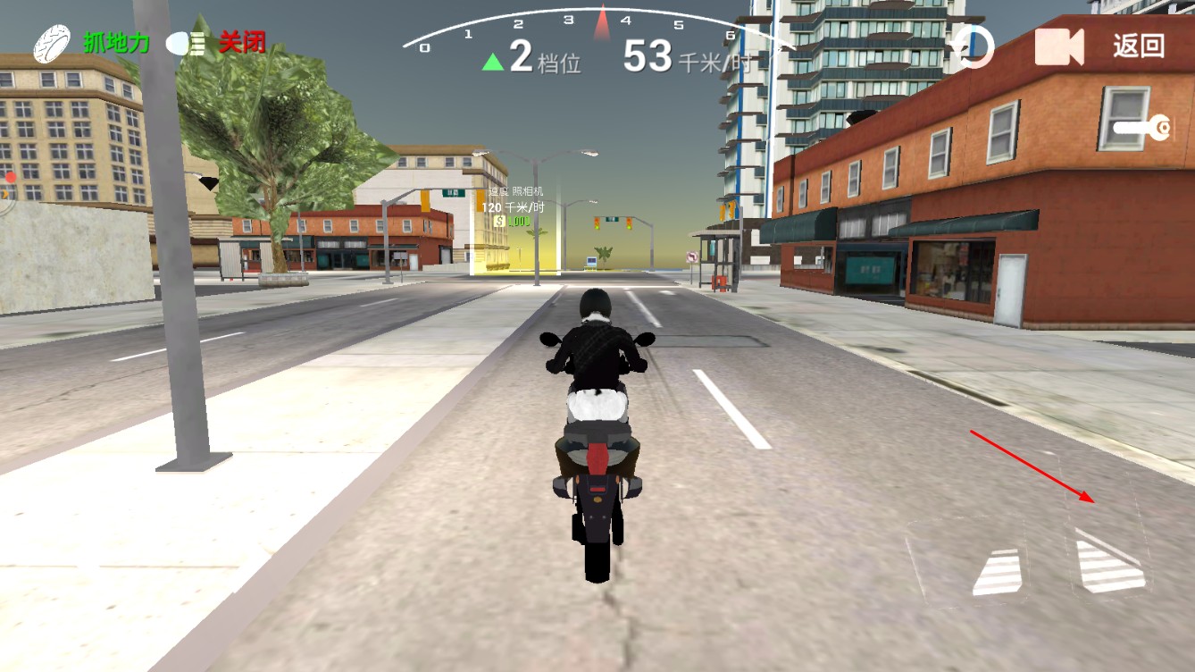 3、驾驶时,按右侧加速键,提升摩托速度,畅快行驶。
