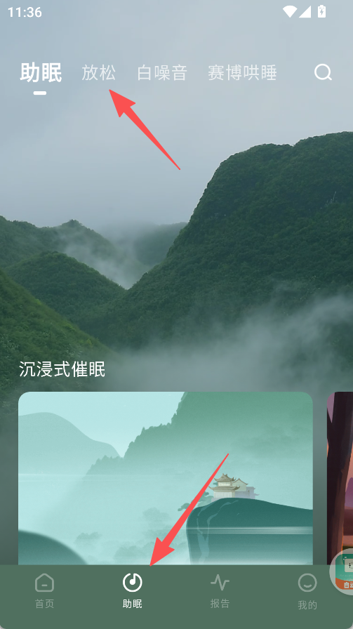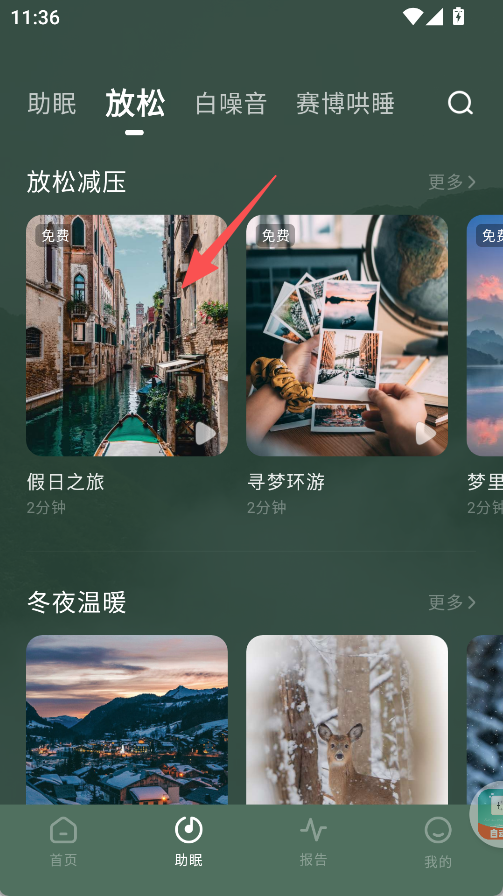 1、点击底部“助眠”、选择顶部“放松”分类,查看各类放松内容。