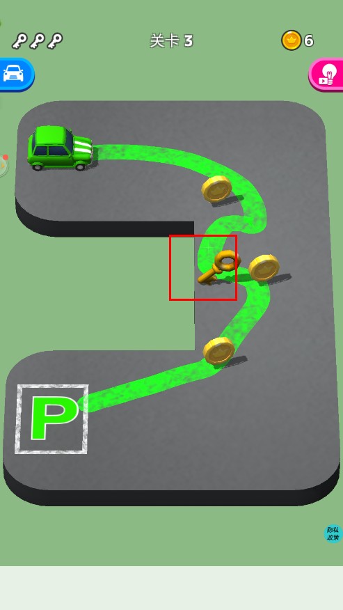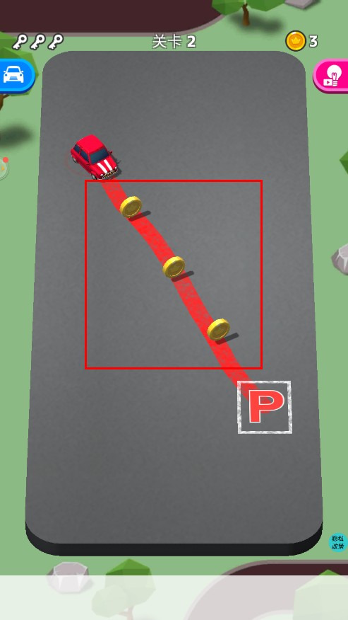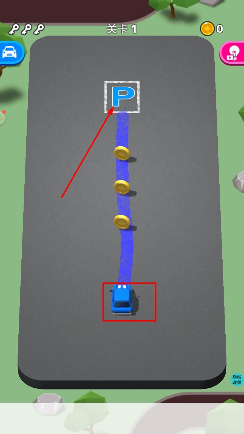 2、画出线条驾驶红色小车,沿红色路径,收集金币,精准停入“P”区。