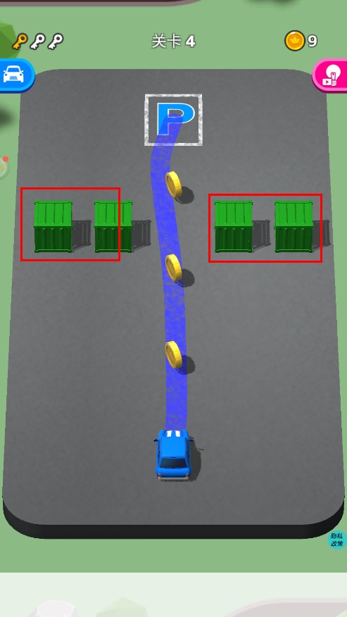 4、注意避让两侧绿色集装箱,收集金币,成功停入“P”区。