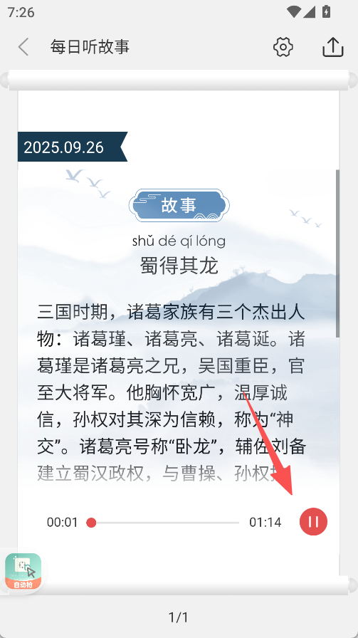 1、进入“每日听故事”、聆听带拼音与文字的成语故事,控制播放进度。