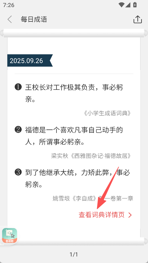 2、“每日成语”板块内容扎实,展示同一成语在多部不同文献里的用例,涵盖不同作者与作品。
