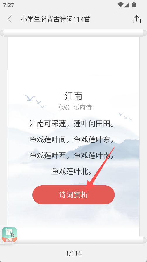 3、打开“小学生必背古诗词114首”、查看诗词原文,点击“诗词赏析”了解更多。