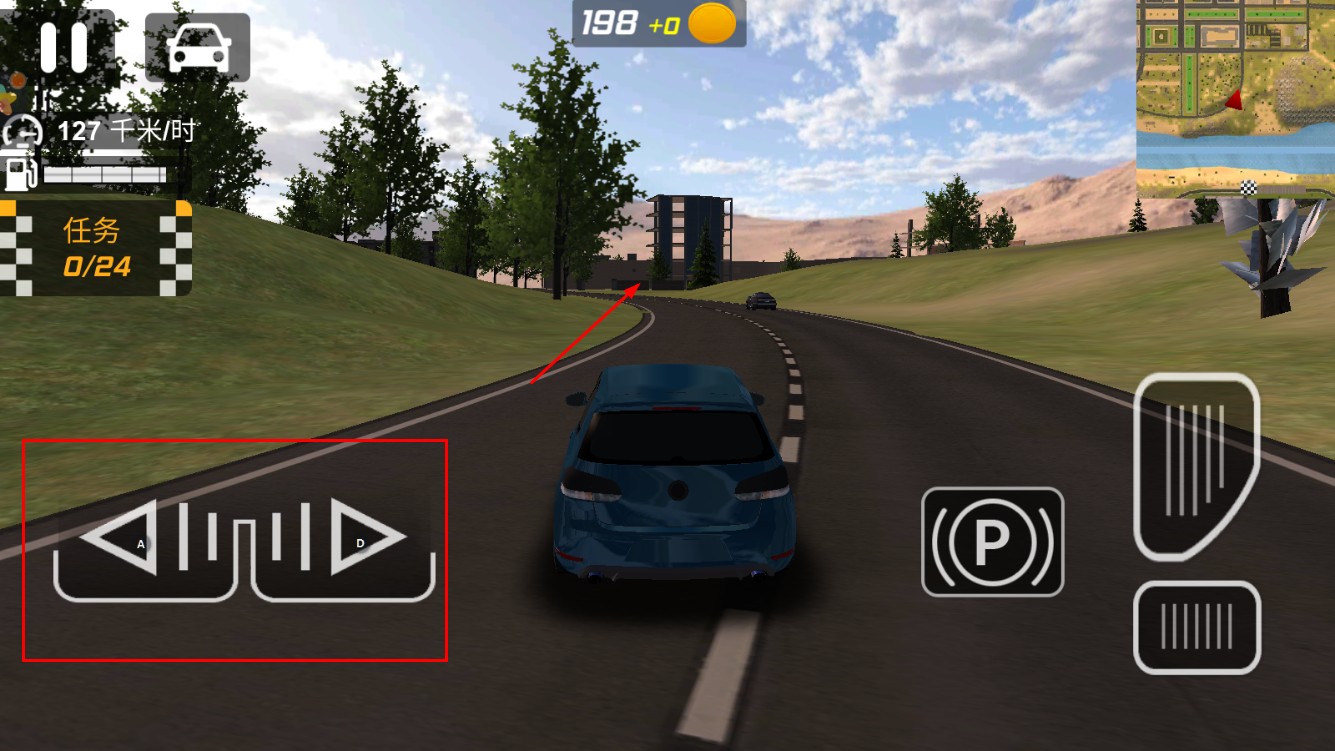 3、通过左侧方向键,控制汽车左右转向,保持在道路上平稳行驶,应对前方弯道路况。