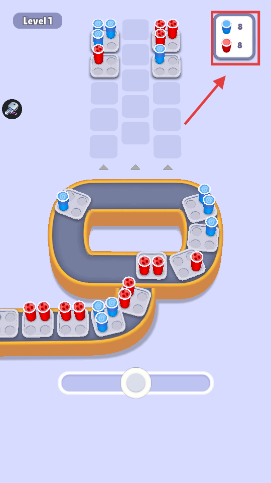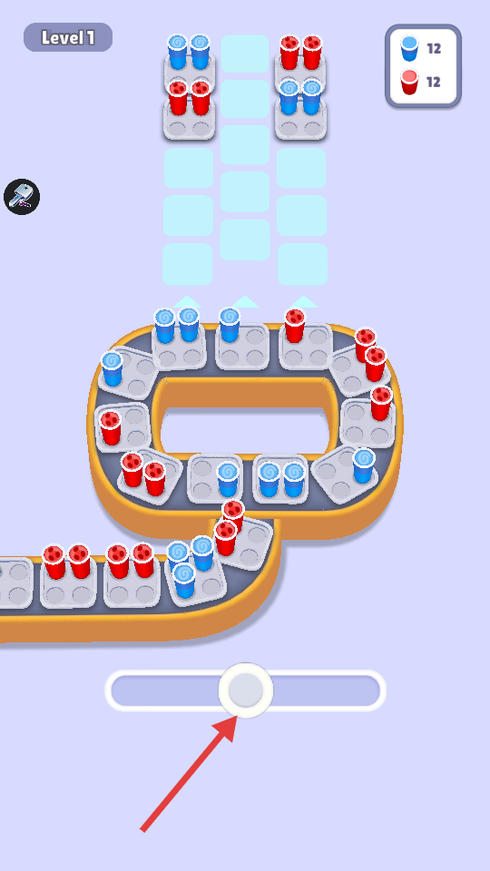 1、在Level1中,滑动下方操控按钮,控制传送带运输红蓝杯子。