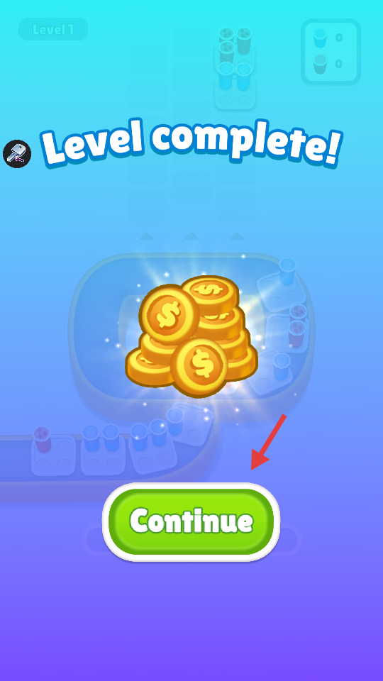 4、成功完成Level1后,界面显示“Levelcomplete!”,点击绿色“Continue”按钮,继续下一关。