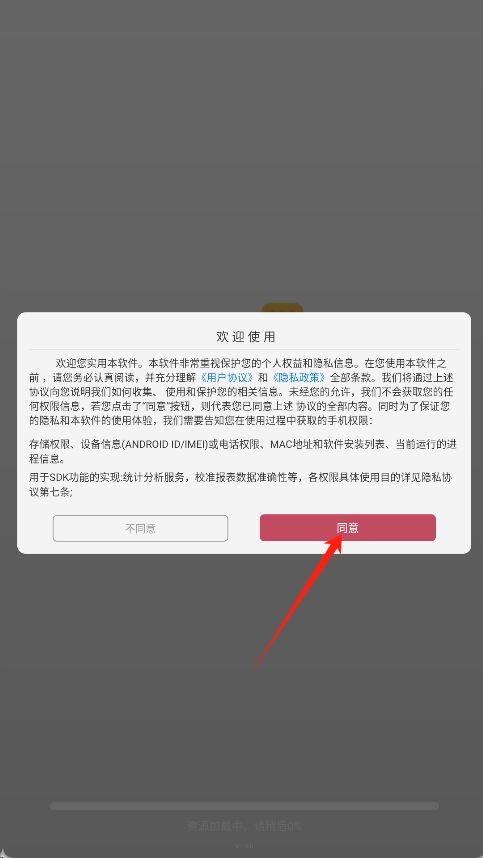 1、打开软件后权限说明弹窗中,点击右下角的“同意”按钮。