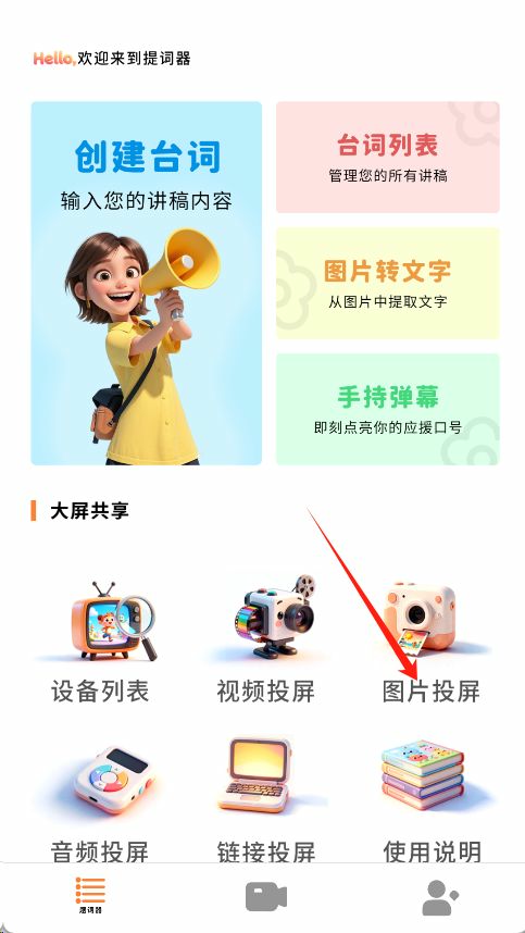2、进入主界面,找到“大屏共享”区域,点击其中的“图片投屏”功能图标。