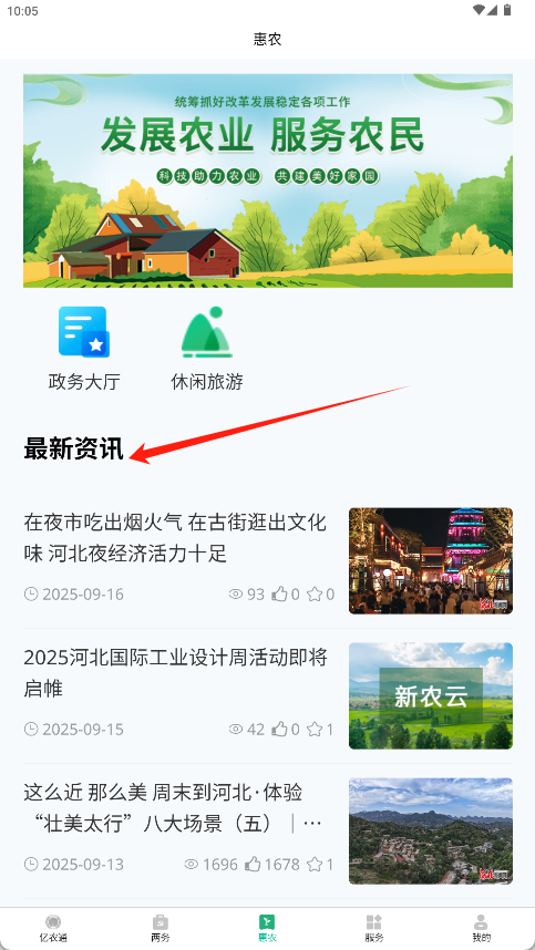 2、进入惠农频道后,在“最新资讯”板块里,选择一篇想要阅读的文章标题。