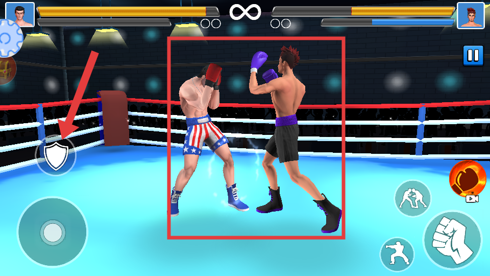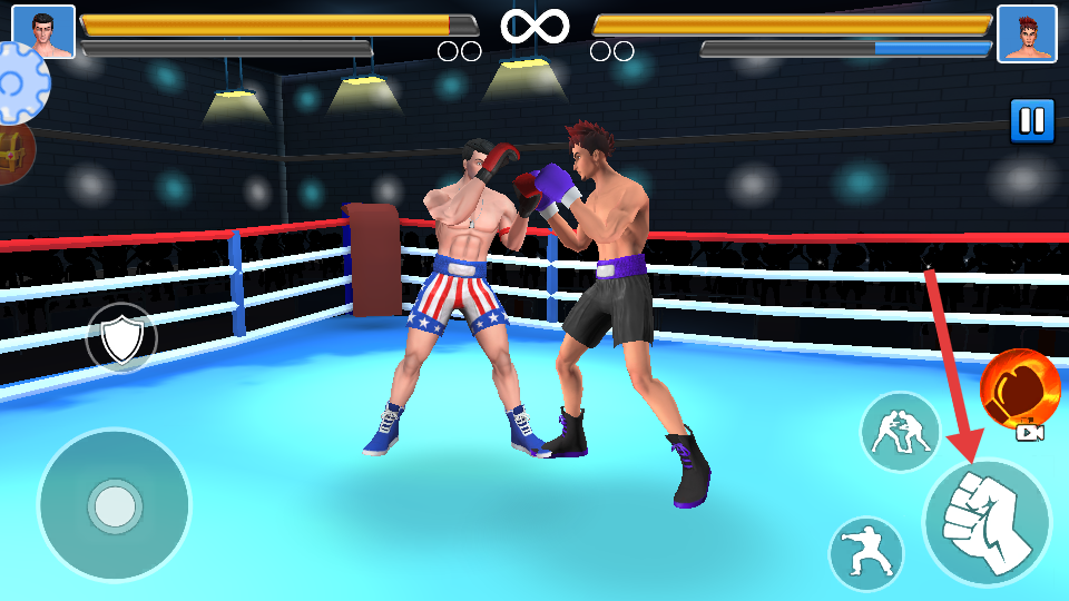 2、进入拳击场,利用屏幕右下方的【拳头】攻击按钮,瞅准时机点击对对手发动攻击。