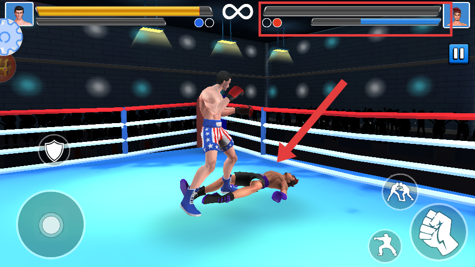 4、观察屏幕上方的【血条】,持续攻击对手,当对手血条清空倒地,即可赢得本场拳击比赛胜利。