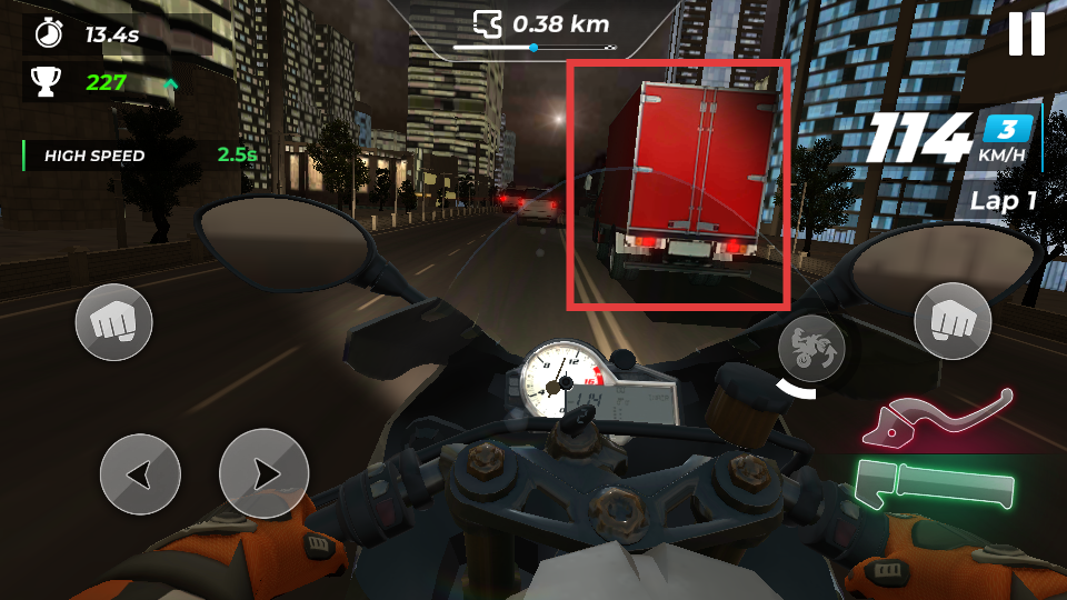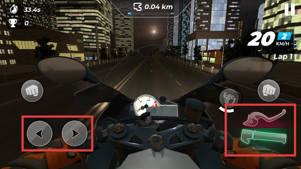 2、进入游戏后,通过点击屏幕左侧的【方向按钮】控制摩托车转向,点击屏幕右侧的【油门按钮】加速前进。