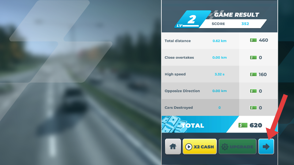 4、完成一局游戏后,查看游戏结果界面的得分、行驶距离等信息,点击右下角的【箭头按钮】返回主界面。