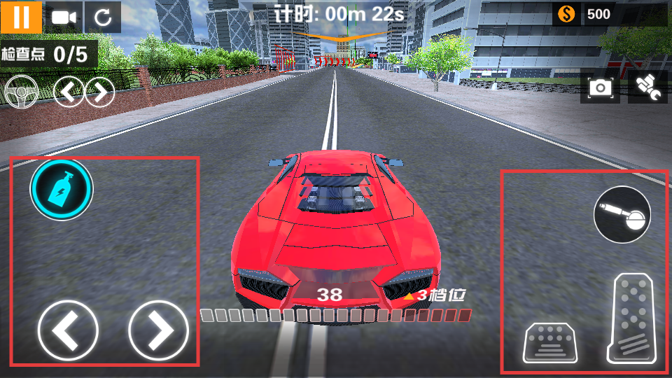 2、驾驶时,用左侧【方向按钮】控制转向,右侧【油门】【刹车】和换挡按钮调节车速与挡位,还能点左上方【氮气】按钮加速。