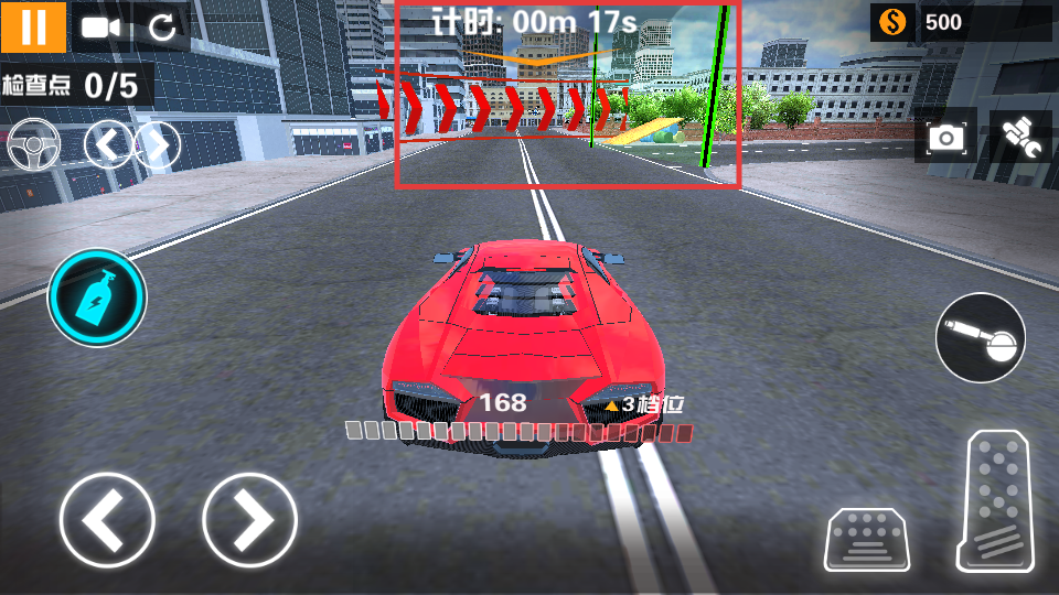 3、留意上方【计时】和【检查点-0/5】提示,在规定时间内,避开道路障碍,按顺序通过检查点。