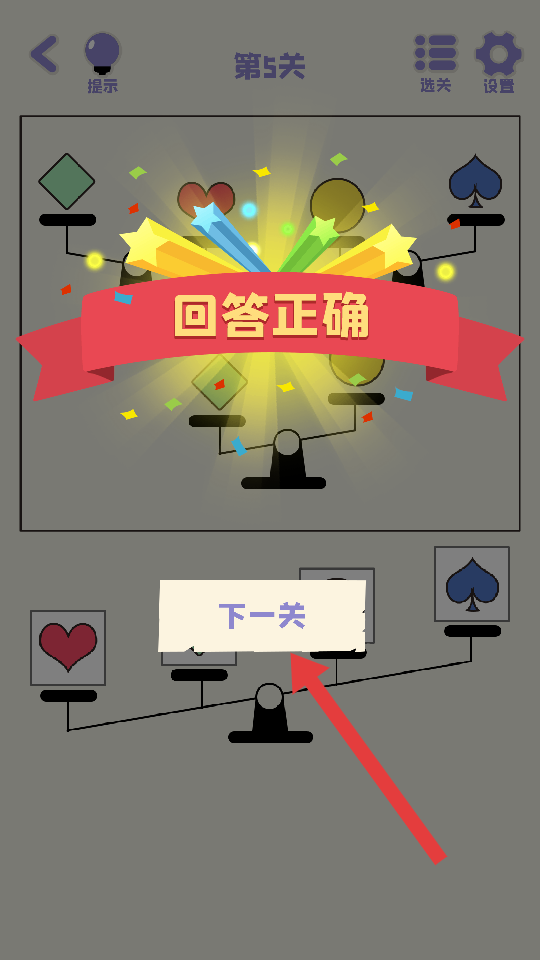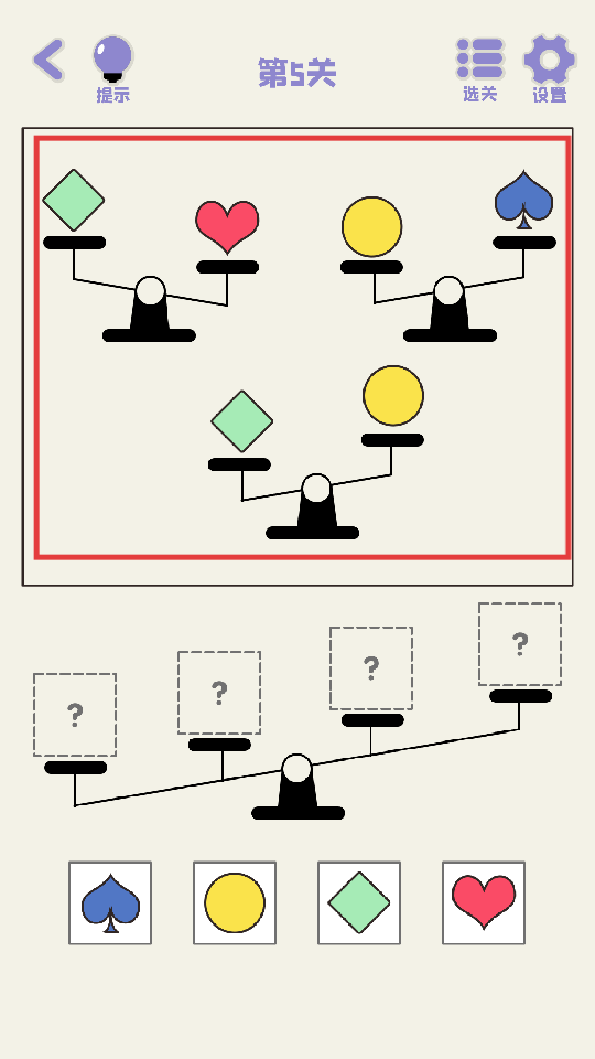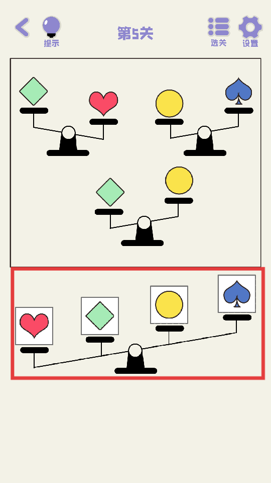 2、进入如【第5关】这样的关卡后,观察红框内【天平上不同图案的重量关系】,思考解题思路。