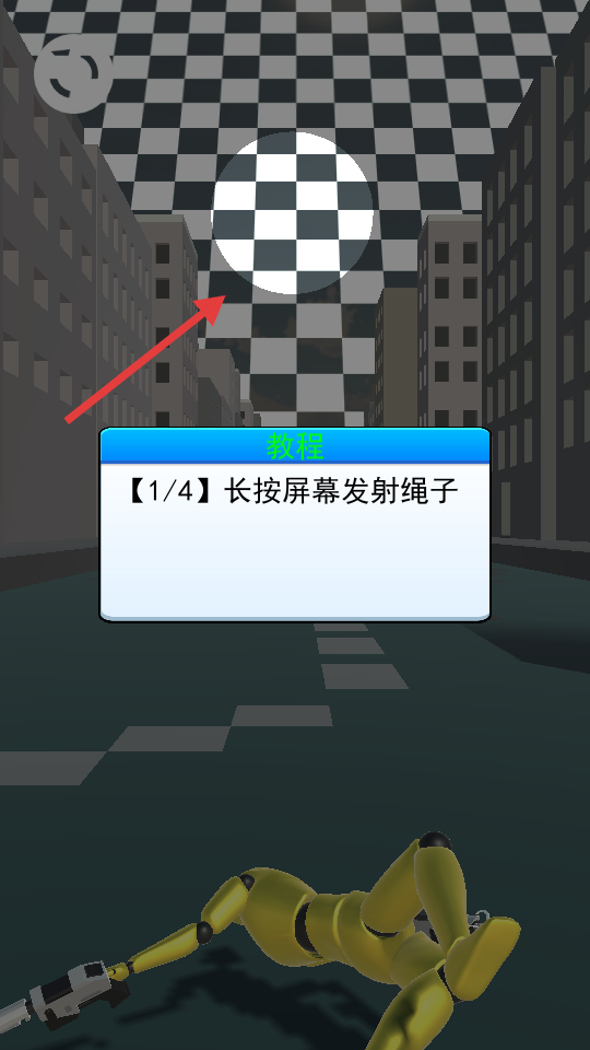 2、按照教程【1/4】-长按屏幕发射绳子,瞄准上方棋盘格区域,为飞荡做准备。