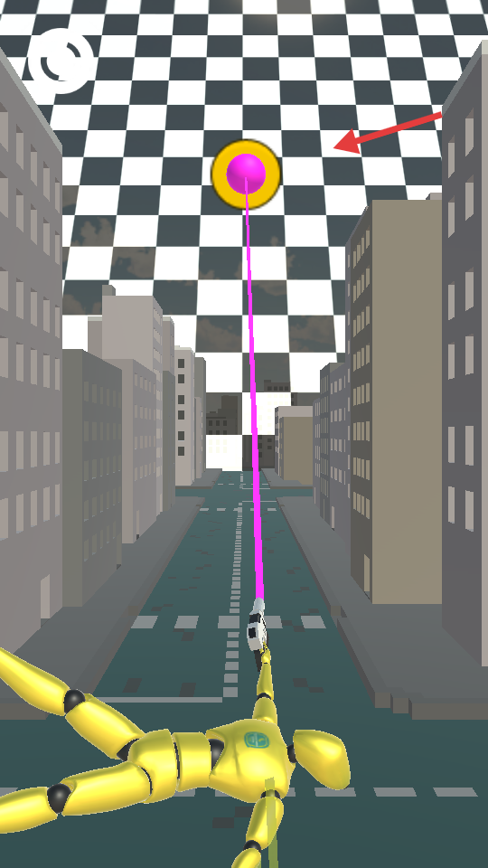 3、发射粉色绳子,让其吸附到上方黄色圆环,借助绳子让黄色人偶向终点前进。