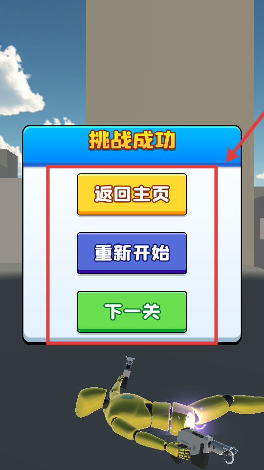 4、挑战成功后,可选择【返回主页】【重新开始】或【下一关】,继续游戏进程。